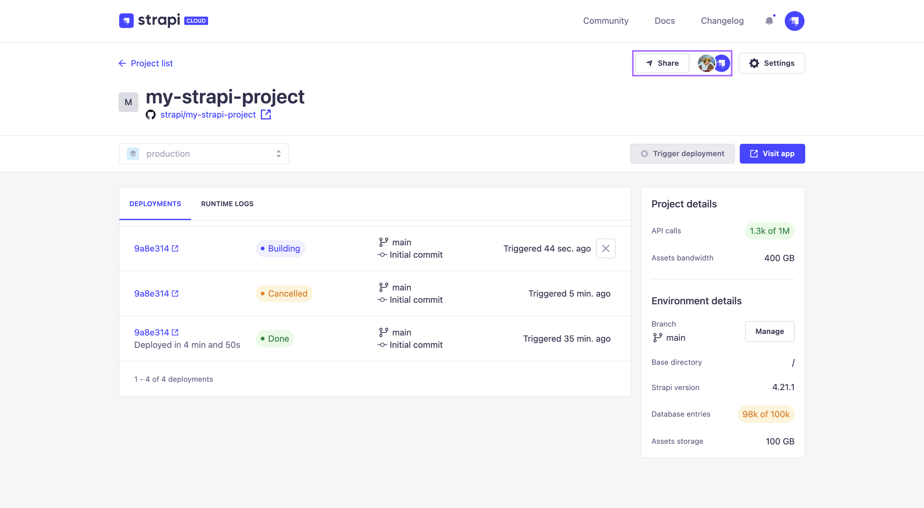 New maintainers will be sent an email containing a link to click on to join the project. Once a project is shared, avatars representing the maintainers will be displayed in the project dashboard's header, next to the Share button, to see how many maintainers collaborate on that project and who they are.