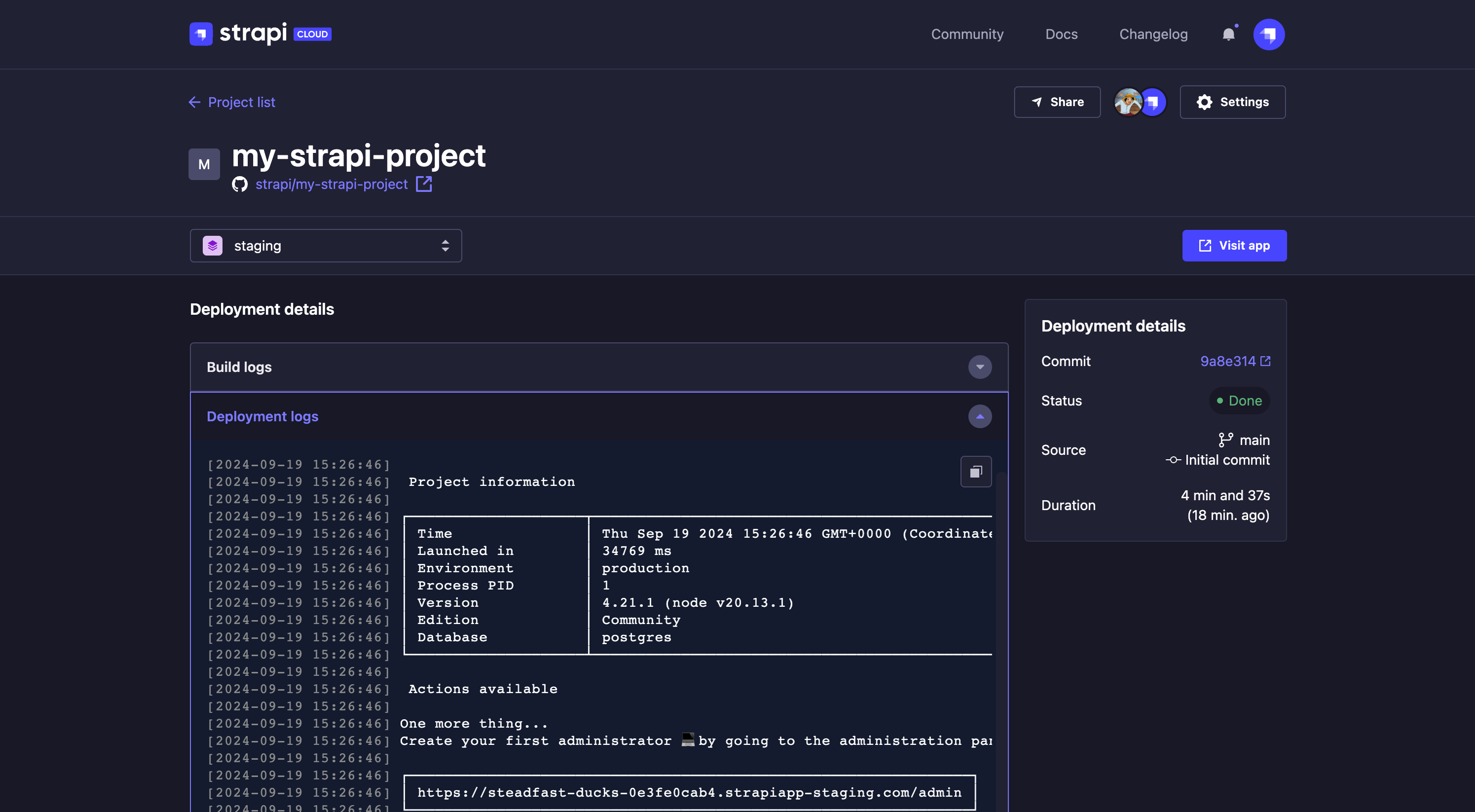 For each Strapi Cloud project, you can access the history of all deployments that occured and their details including build and deploy logs. This information is available in the Deployments tab.